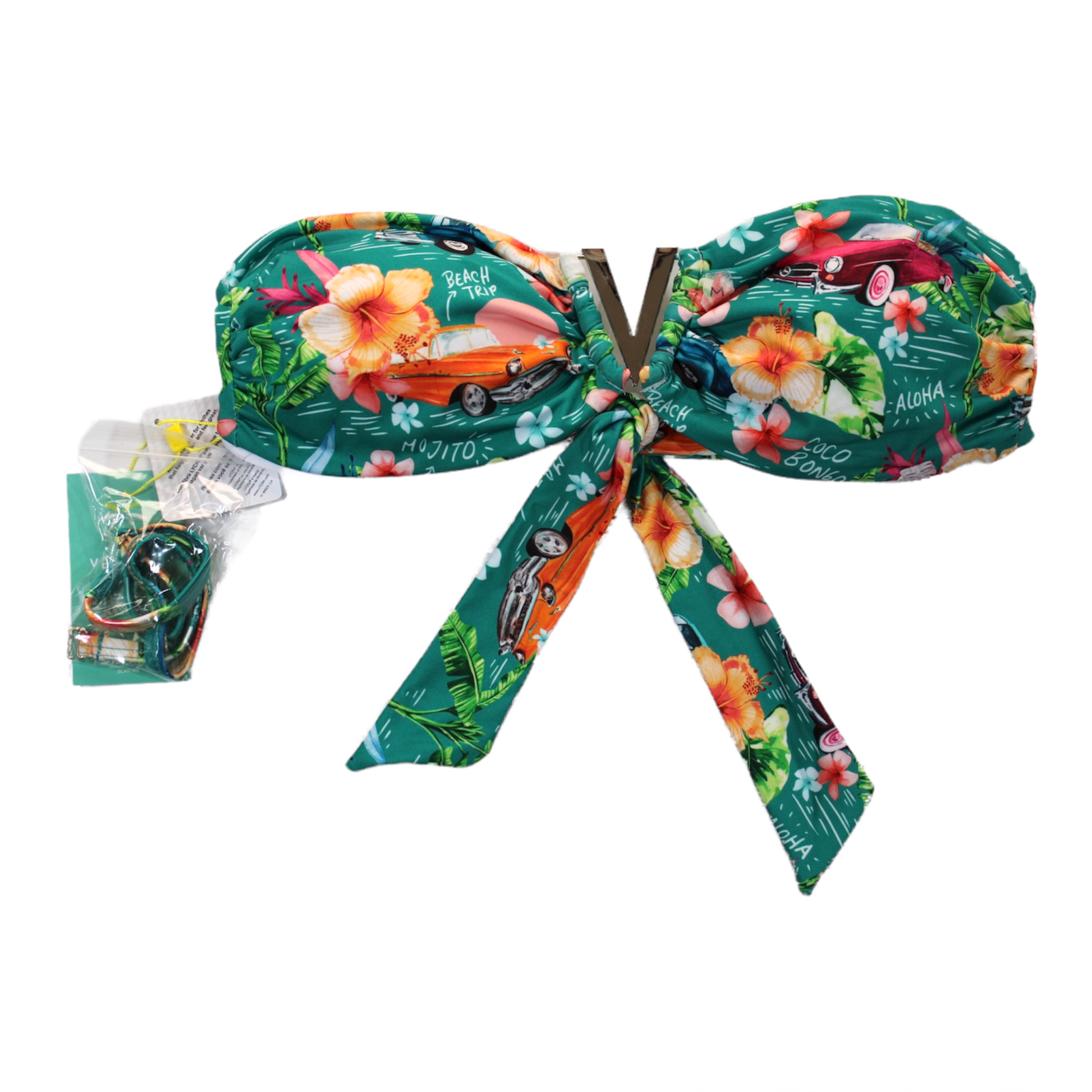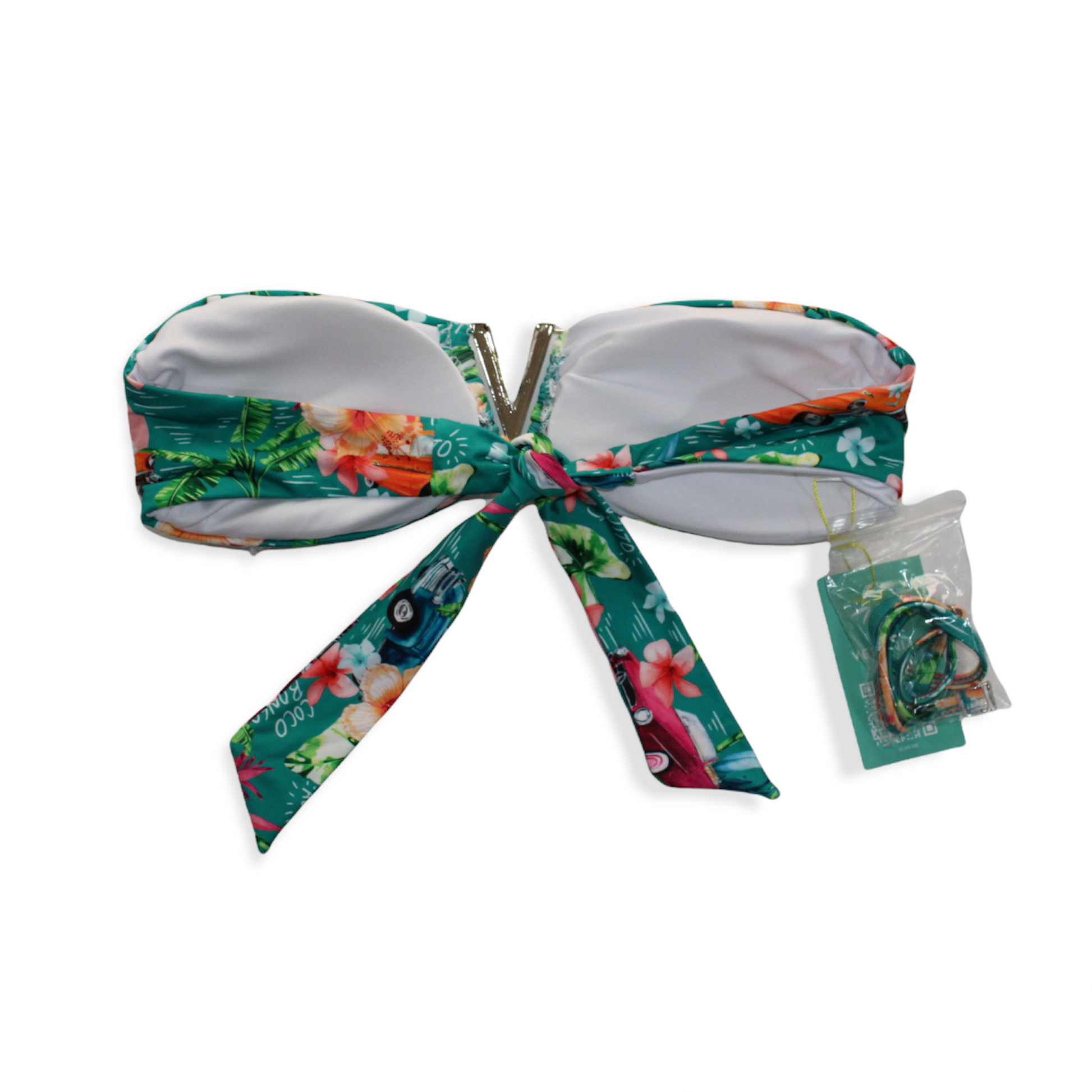 Top con hebilla al centro, copas desmontables, cinta ajustable al cuello y amarres en espalda