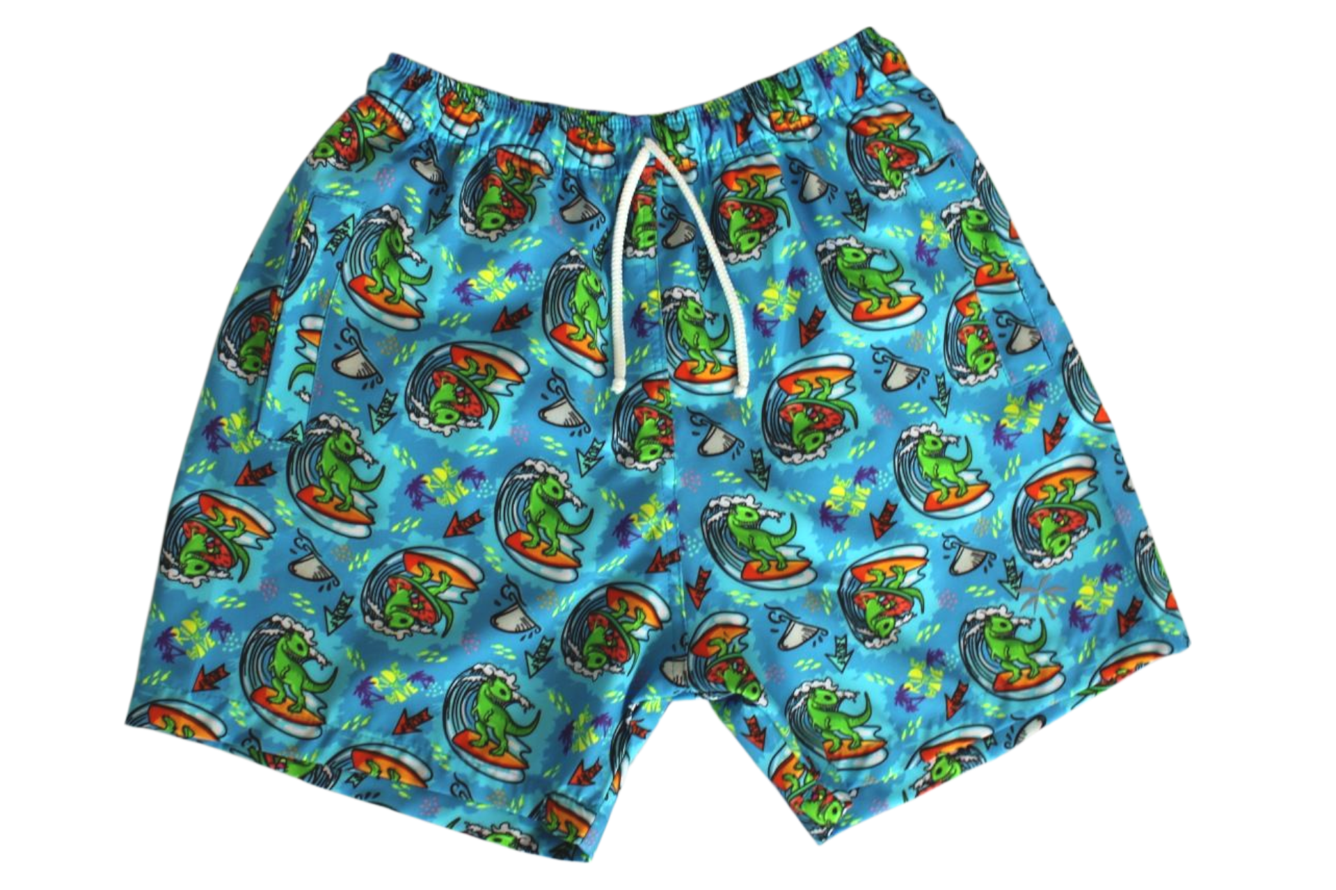 La diversión está asegurada con esta bermuda infantil de estampado vibrante. Diseñada para los pequeños llenos de energía, su print de dinosaurios surfistas sobre un fondo azul turquesa la convierte en la prenda favorita para días de sol, playa y alberca.