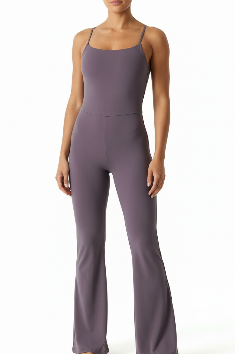 Descubre la comodidad absoluta con nuestro Enterizo Deportivo Lavanda, diseñado para moverse contigo con suavidad, estilo y libertad. Su silueta estilizada con tirantes delgados y piernas acampanadas crea un efecto visual que alarga la figura, mientras que su tela suave, fresca y de alto rendimiento se adapta perfectamente al cuerpo.