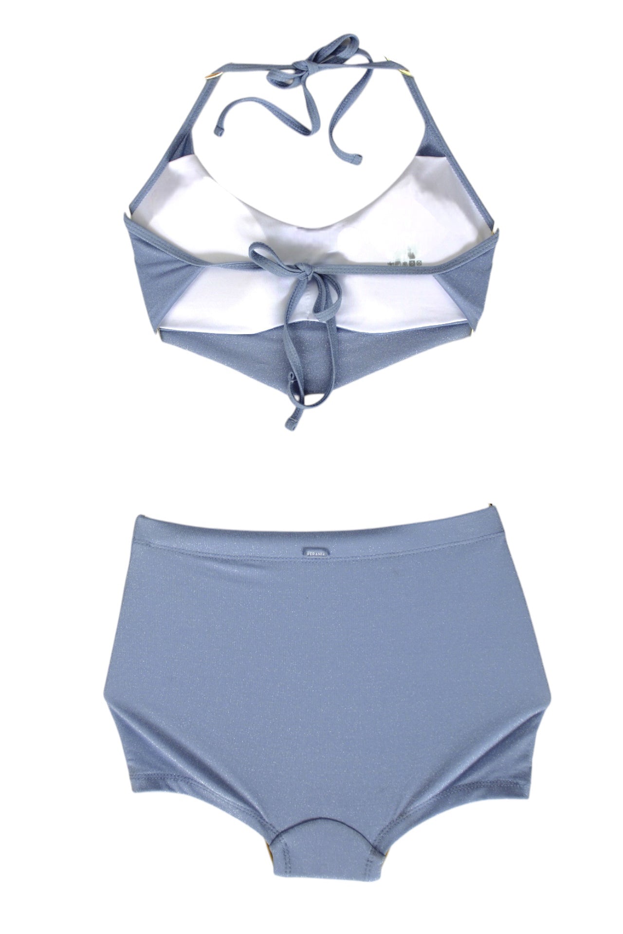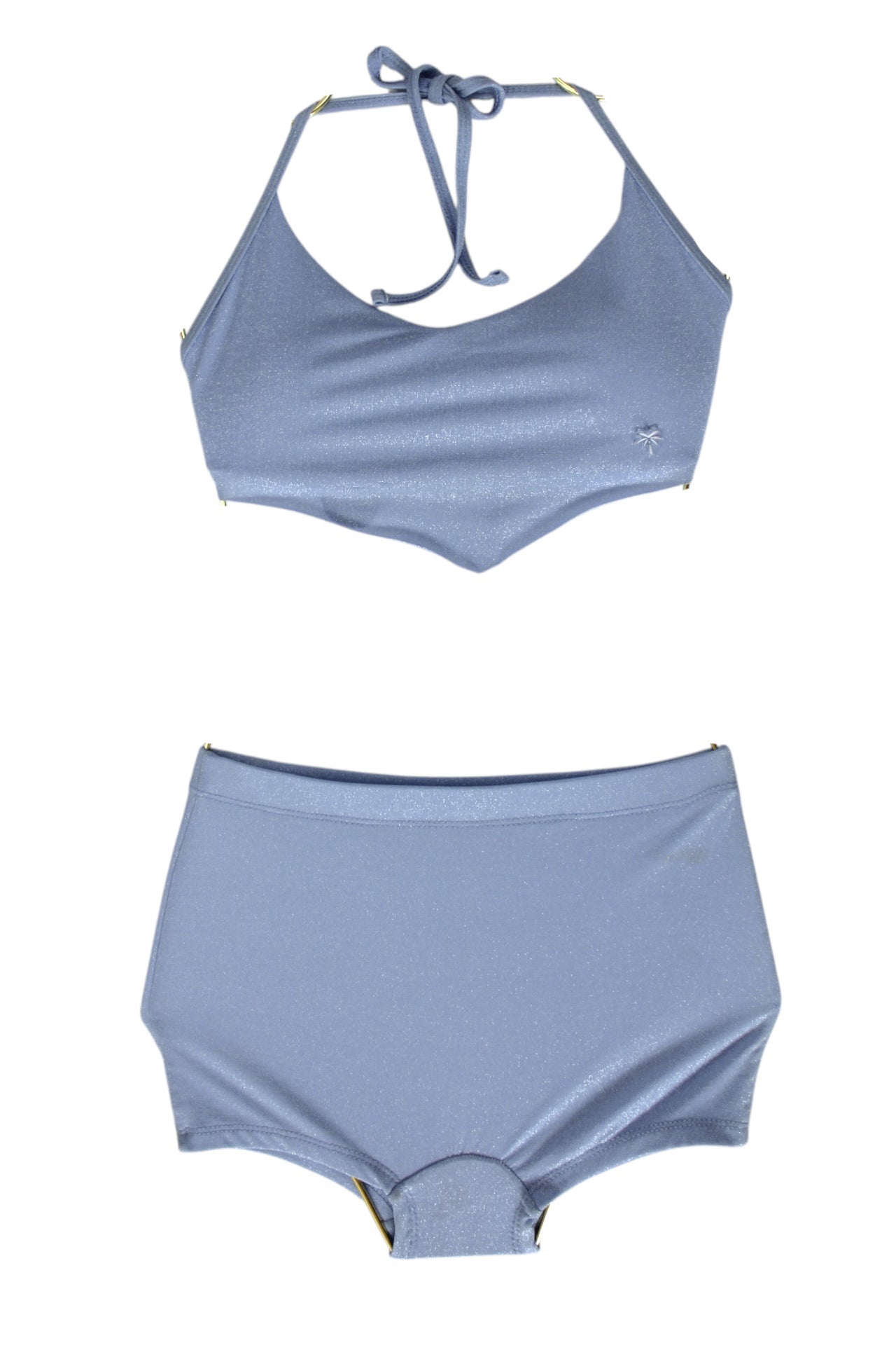 Bikini con Panty de talle alto  que hace que te de buena figura, top en triángulo con almohadillas removibles, y amarres en espalda y cuello. Tela brillosa.