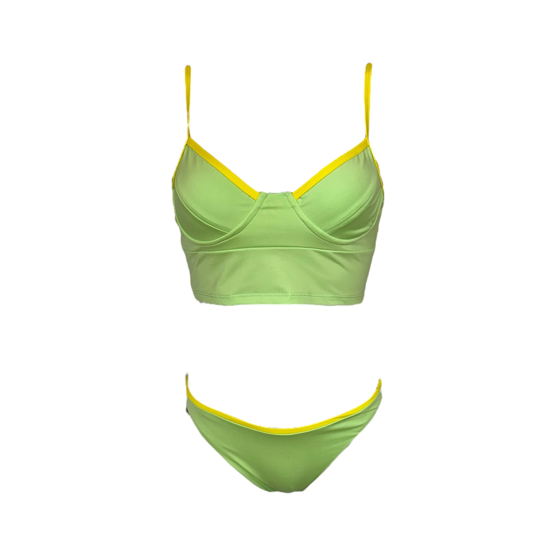 Este set de dos piezas Tulum largo verde está diseñado para brindar una sujeción óptima y un estilo elegante. El top cuenta con un corte alto y ajustes en los tirantes, mientras que el panty presenta costuras ocultas y brilla para mayor soporte y estilo. Ideal para una apariencia de playa.